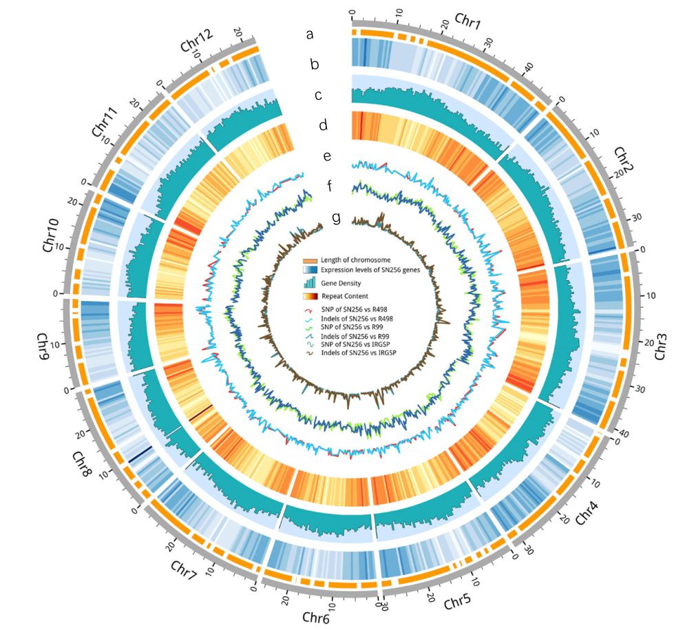 為了填補(bǔ)北方超級(jí)稻高質(zhì)量基因組序列的gaps,作者對(duì)SN265基因組進(jìn)行了de novo測(cè)序和組裝。利用P5-C3 SMRT測(cè)序,獲得24.94 Gb的原始數(shù)據(jù),平均讀長(zhǎng)為9.6 kb,二代測(cè)序共獲得22.05 Gb的原始數(shù)據(jù),組裝得到SN265的基因組,大小為364.45 Mb,contig N50 達(dá)到6.96 Mb,通過(guò)從頭預(yù)測(cè)、同源預(yù)測(cè)以及RNA-seq分析后共獲得37,609個(gè)基因(圖2)。對(duì)R99進(jìn)行低深度(30×)三代重測(cè)序和基因組組裝,獲得了R99389.6 Mb的基因組,contig N50也達(dá)到3.05 Mb(圖2)。