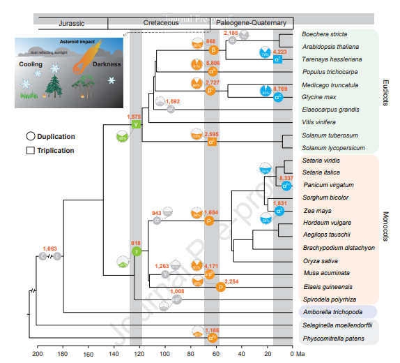 多倍化(polyploidy)或全基因組加倍(whole genome duplication, WGD)事件使基因組內的所有基因都發(fā)生重復,為生物進化提供了原始的遺傳材料,被認為是進化的加速器。全基因組復制事件在真菌或動植物中都有發(fā)生,是基因組中基因數(shù)量變化、基因新功能的形成、基因重排等的重要推動力。