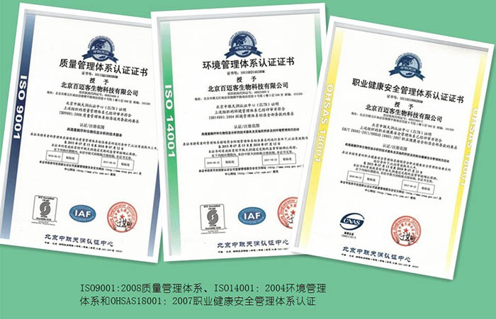 近日,北京百邁客生物科技有限公司順利通過ISO9001:2008質(zhì)量管理體系、ISO14001:2004環(huán)境管理體系和OHSAS18001:2007職業(yè)健康安全管理體系認(rèn)證(簡(jiǎn)稱QES),這標(biāo)志著公司向管理標(biāo)準(zhǔn)化、規(guī)范化和程序化方向發(fā)展邁進(jìn)了一大步。
