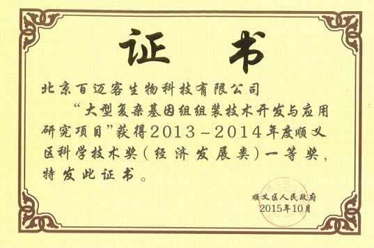 1月19日上午9:00,順義區(qū)科技技術(shù)獎勵大會在北京市順義賓館隆重召開,北京市科學(xué)技術(shù)委員會張光連副主任、順義區(qū)政府朱家亮副區(qū)長、順義區(qū)科學(xué)技術(shù) 委員會金泰希主任及區(qū)各委、辦、局、園區(qū)、鎮(zhèn)代表出席了本次大會。大會對獲得2013年至2014年度的科學(xué)技術(shù)獎的單位進(jìn)行了表彰。其中百邁客公司自主 研發(fā)的《大型復(fù)雜基因組組裝技術(shù)開發(fā)與應(yīng)用研究》項目榮獲經(jīng)濟(jì)發(fā)展類獎項一等獎。
