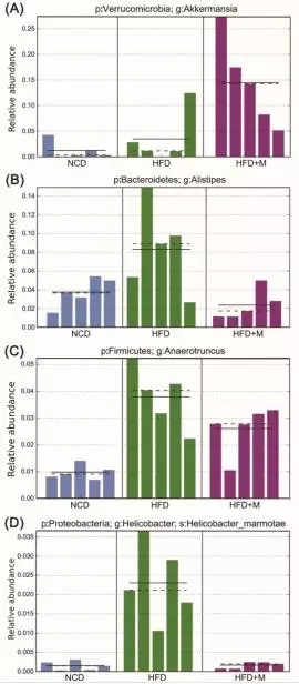 2) LEfSe分析,發(fā)現(xiàn)褪黑素顯著提高Akkermansia的相對豐度,Akkermansia即是降低高脂肪膳食小鼠體重的有益菌。而褪黑素顯著降低Alistipes、Anaerotruncus、Helicobacter?marmotae的相對豐度,則這三種細菌預防肥胖的有害菌??傊?,褪黑素能夠使高脂肪膳食小鼠的腸道菌群由失調狀態(tài)轉為正常狀態(tài),從而抑制體重的增加。