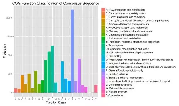 2.用BLASTX將組裝得到的序列與Nr,Swiss-Prot,GO,COG和KEGG數(shù)據(jù)庫進(jìn)行比對,共有8288個Unigenes注釋到了25個COG類別中的11713個功能。有585個Unigenes注釋到“碳水化合物的運(yùn)輸和代謝”。