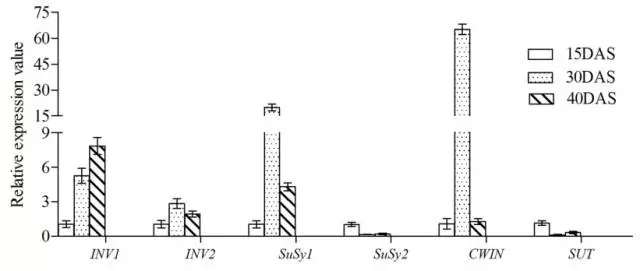 5.使用qRT-PCR驗(yàn)證參與蔗糖代謝的差異表達(dá)基因。這6個差異表達(dá)基因的表達(dá)水平與RNA-seq結(jié)果是一致的。