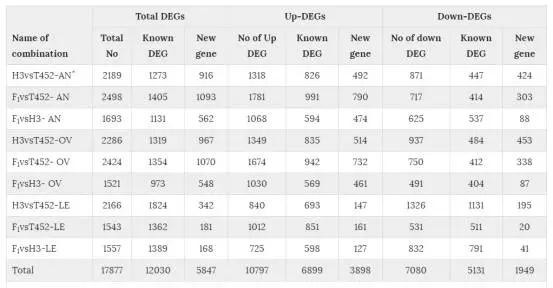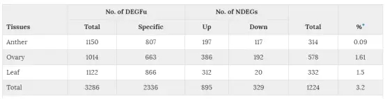 表2:三個不同組織中的差異表達(dá)基因統(tǒng)計。AN:花藥;OV:子房;LE:葉片。