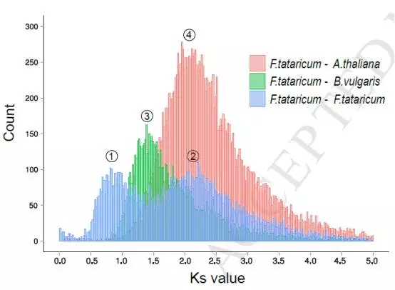 通過苦蕎與擬南芥、苦蕎與甜菜進行分析,通過Ks計算發(fā)現(xiàn)苦蕎經(jīng)歷了全基因組復制事件,近期是在下圖0.84-0.92之間,而更古老的一次復制發(fā)現(xiàn)在64.42~70.77 Mya。而全基因組復制事件的發(fā)生,也導致了很多與抗逆相關(guān)基因家族的擴張或者保留。這也與后期苦蕎的抗逆性有一定關(guān)系。