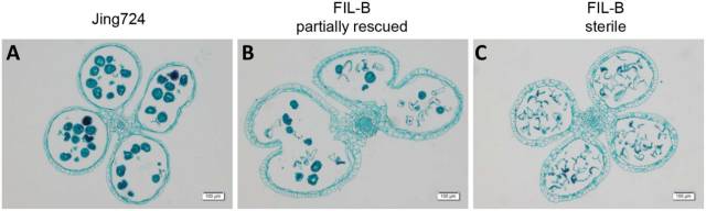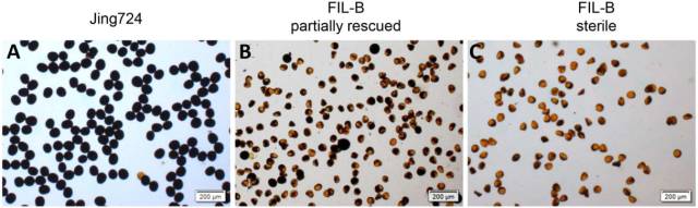 1、育性分析:FIL-B(育性不穩(wěn)定系)分為育性部分恢復(fù)的植株和完全不育植株,本項(xiàng)目所構(gòu)建的BC4群體462個(gè)子代中有14.9% 的植株為育性部分恢復(fù)的表型。育性部分恢復(fù)植株的花粉大小小于正?;ǚ郏笥谕耆挥仓甑幕ǚ郏‵ig 1.)。經(jīng)I2-KI染色后的不育花粉表現(xiàn)出形態(tài)的不規(guī)則和染色的異常(Fig 2.)。