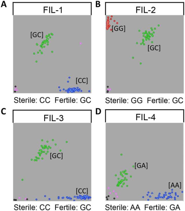 本研究選取BC4群體中50株育性部分恢復(fù)植株和50株不育植株,分別提取DNA,對(duì)候選的兩個(gè)蛋白基因共4個(gè)SNP位點(diǎn)進(jìn)行KASP驗(yàn)證,發(fā)現(xiàn)在不同的表型下會(huì)出現(xiàn)不同的基因型,再次暗示這兩個(gè)基因很可能是與育性不穩(wěn)定相關(guān)。