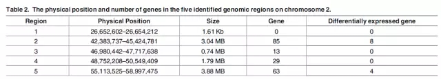 4、BSR關(guān)聯(lián)分析:與參考基因組比對(duì)后,F(xiàn)池和S池分別獲得171,594和 170,820個(gè) SNP,選取混池間差異的SNP位點(diǎn),進(jìn)行ED關(guān)聯(lián)分析,共得到5個(gè)候選區(qū)域(Fig 4.),結(jié)合數(shù)據(jù)庫注釋結(jié)果及轉(zhuǎn)錄組差異基因的結(jié)果,最終獲得12個(gè)候選基因(Table 2、Table 3)。