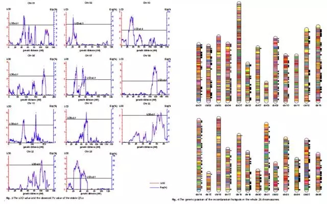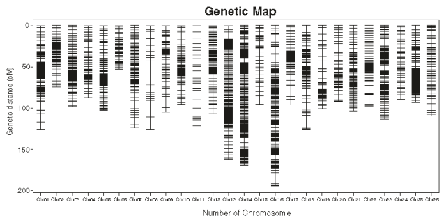 (2)重組熱點(diǎn)分析發(fā)現(xiàn)26條連鎖群中,21條含有重組熱點(diǎn)區(qū)域,A套中9條LG含有重組熱點(diǎn),D套中12條LG含有重組熱點(diǎn)。所有LG中,13號(hào)含有重組熱點(diǎn)最多,有196個(gè)。