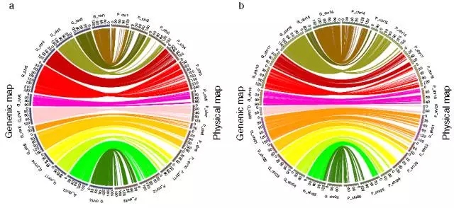 (1)遺傳圖與棉花物理圖譜共線性分析發(fā)現(xiàn)圖譜覆蓋度良好,絕大多數(shù)的SNP與物理圖譜的共線性良好,相對(duì)于A基因組而言,D基因組的共線性更好。