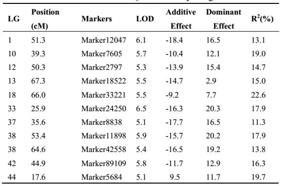 利用區(qū)間作圖法,定位到體重和體長QTL共11個,共可解釋表型變異為38.56%。其中位于連鎖群33標(biāo)記24250位置的QTL解釋表型變異達(dá)到17.9%,LOD值為6.5,為一主效QTL。