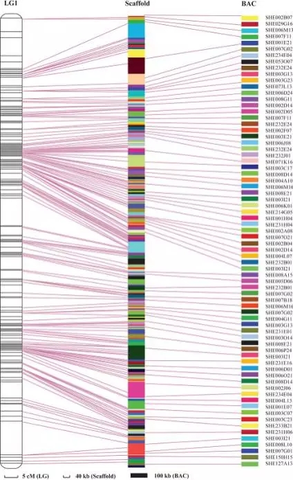 白對蝦是一個高雜合物種,其基因組含有80%的重復(fù)序列,其基因組組裝是一個很大的難題。本研究通過對遺傳圖譜、白對蝦初步組裝的Scaffold、BAC測序的序列進(jìn)行共線性比較,最終使得5922個標(biāo)記錨定到5885個Scaffold上,有利于后續(xù)白對蝦的基因組組裝。