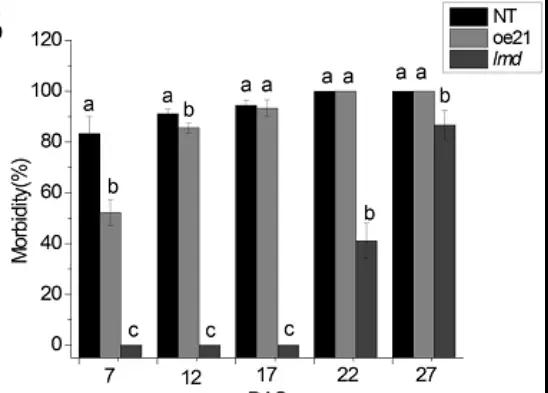 研究發(fā)現(xiàn)類病變突變體增強(qiáng)了對病原菌的抗性,為了測試lmd突變體是否對Alternaria alternata有抗性,作者將孢子懸浮液噴灑在NT、oe21和lmd幼苗上。7天之后,NT和oe21感染嚴(yán)重,出現(xiàn)了幾片枯萎葉片,而在lmd突變體中觀察到的枯萎葉片很少,盡管其葉片上有許多病變(圖11)。噴施17天后,NT和oe21的發(fā)病率均在90%以上,但lmd仍未出現(xiàn)感染葉片。lmd的發(fā)病時(shí)間出現(xiàn)在噴灑后22天,而此時(shí),lmd的發(fā)病率為45.55%,但NT和oe21的發(fā)病率均為100%(圖12)。
