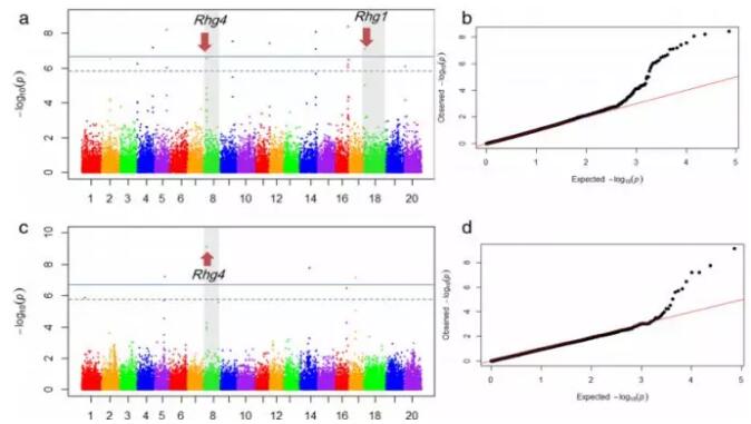 (2)通過(guò)全基因組關(guān)聯(lián)分析找到19個(gè)與胞囊線蟲抗性相關(guān)的位點(diǎn),其中8個(gè)位點(diǎn)與之前報(bào)道過(guò)的QTL位點(diǎn)重合,8個(gè)位點(diǎn)與已經(jīng)報(bào)道的抗胞囊線蟲基因Rhg4及Rhg1連鎖,并鑒定出3個(gè)新的QTL位點(diǎn)。通過(guò)基因注釋獲得到與抗病,細(xì)胞色素P450,蛋白激酶等相關(guān)的功能基因。
