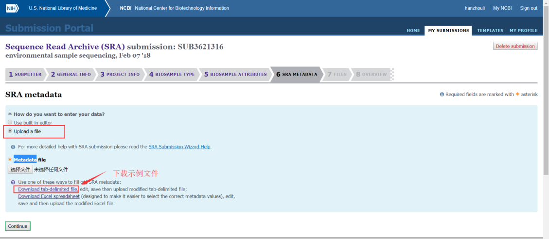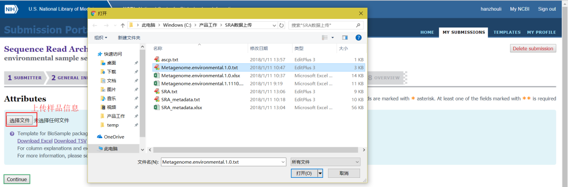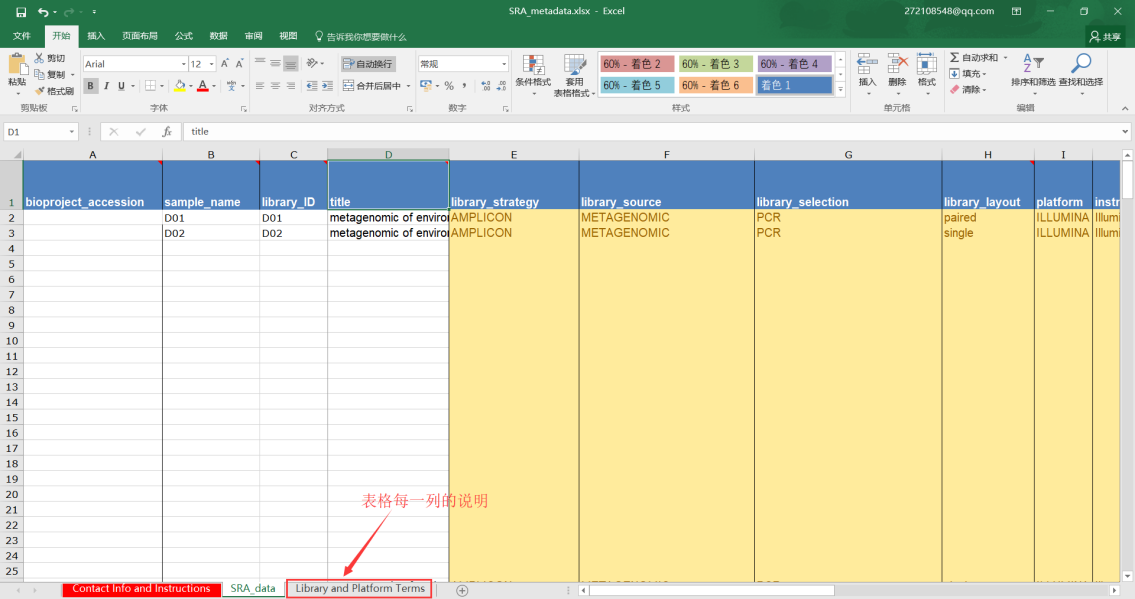 第七步:第六步表格上傳完成后,需要接著上傳Metadata表格,主要填寫樣品建庫(kù)測(cè)序的信息和需要上傳的文件名,填寫完成后也是導(dǎo)入到文本文件中然后上傳;