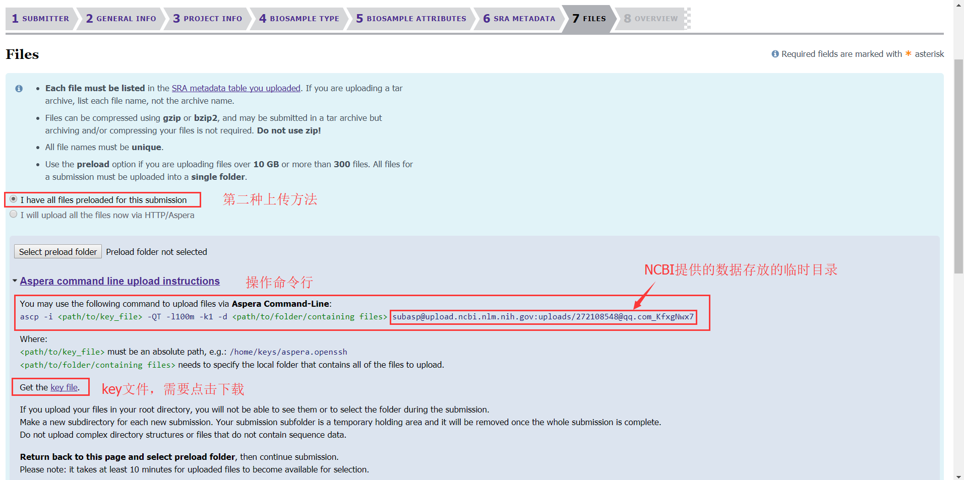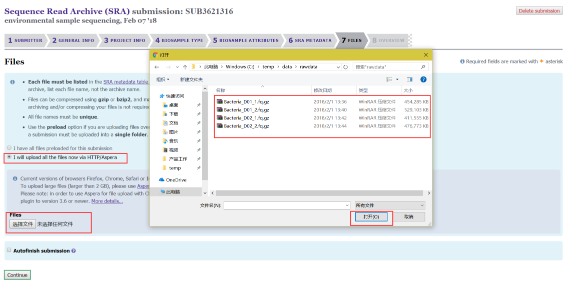 第八步:重點(diǎn)來(lái)了,這一步是將我們的數(shù)據(jù)傳到NCBI的服務(wù)器上,需要下載安裝一個(gè)軟件Aspera(http://downloads.asperasoft.com/connect2/,windows下也可以安裝)。軟件安裝完成后有兩種上傳方法:(1)可以直接上傳,適用于數(shù)據(jù)量小、樣本量小的項(xiàng)目;
