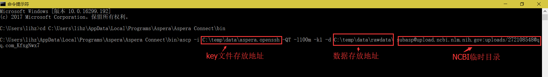 打開(kāi)Windows Dos操作窗口,進(jìn)入到Aspera軟件的安裝目錄下;輸入命令