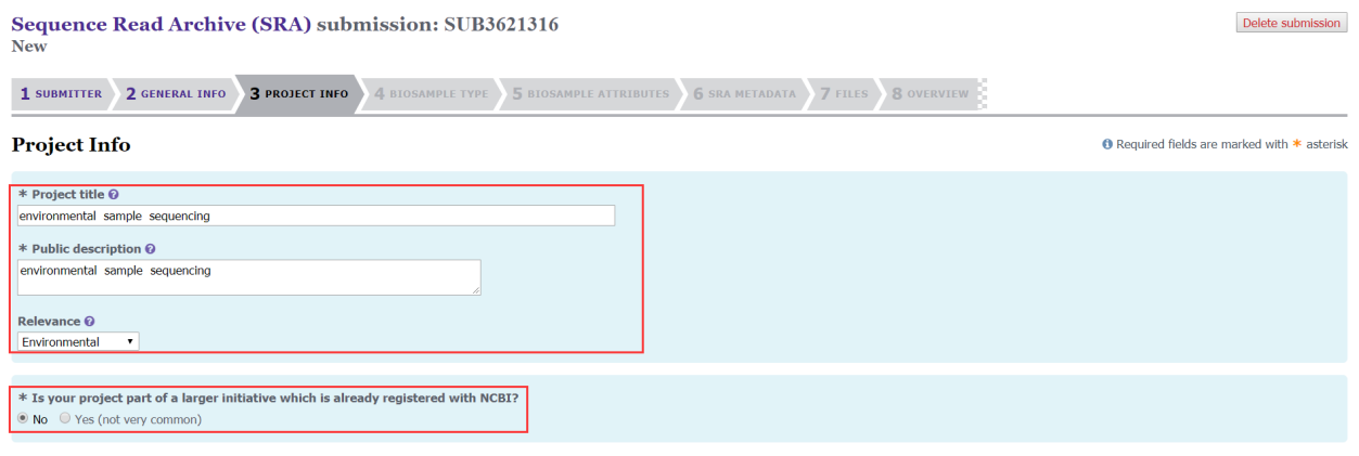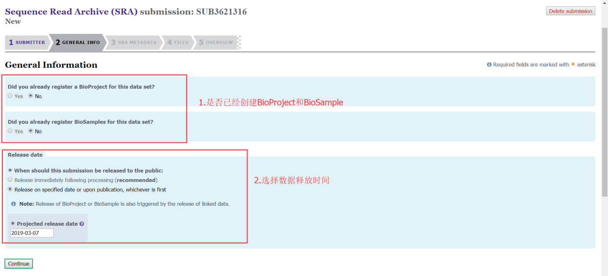 第三步:填寫B(tài)ioSample、BioProject和數(shù)據(jù)釋放時(shí)間(之前沒(méi)有創(chuàng)建BioSample、BioProject可以選擇NO);