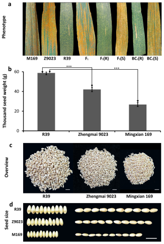在抗性鑒定中發(fā)現(xiàn),其在幼苗期對(duì)7種病菌均呈現(xiàn)感病,而成株期均呈現(xiàn)抗?。▓D1a);而鄭麥9023和銘賢169全生育期均為感病。此外,R39的千粒重顯著高于鄭麥9023和銘賢169,這表明在條銹病發(fā)病條件下,R39的籽粒產(chǎn)量更高,種子質(zhì)量更好(圖1b-d)。