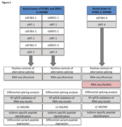 為了測試splicify這種蛋白組學(xué)數(shù)據(jù)的分析方法,建立了一種可以對isoform變化進(jìn)行調(diào)控的實(shí)驗(yàn)?zāi)P?,對SW480結(jié)腸癌細(xì)胞系中的剪接因子SF3B1和SRSF1進(jìn)行siRNA干擾以下調(diào)其表達(dá),然后通過RNA-seq和質(zhì)譜進(jìn)行結(jié)果檢測。