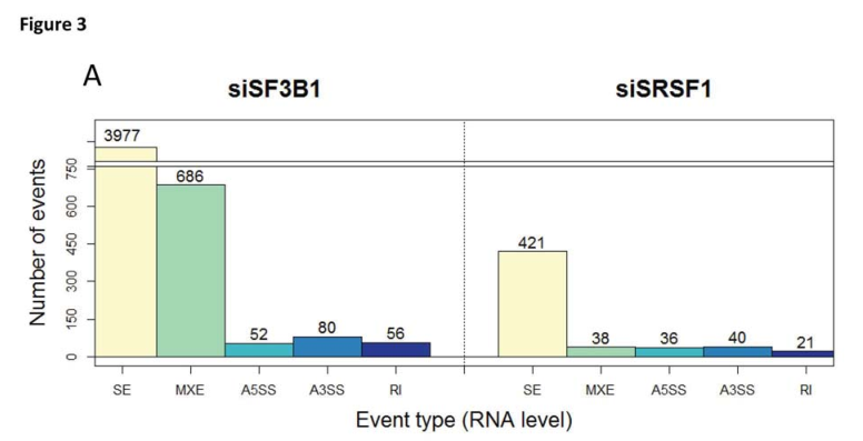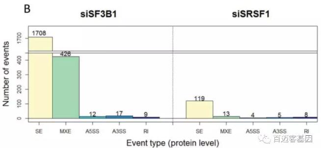 轉(zhuǎn)錄組分析顯示siSF3B1和siSRSF1的可變剪接事件與對照組相比有顯著差異(圖3A),證明對剪接因子的操作導(dǎo)致了差異剪接的產(chǎn)生。