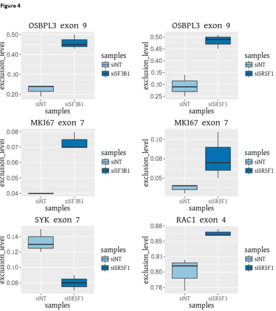 為了進(jìn)一步驗(yàn)證,作者選擇了4個(gè)外顯子跳躍事件進(jìn)行RT-qPCR驗(yàn)證,包括SYK exon 7, RAC1 exon 4, OSBPL3 exon 9, MKI67 exon 7(如圖4所示)。根據(jù)RNA-seq分析,所有的事件在SRSF1下調(diào)后都發(fā)生了差異剪接,而OSBPL3和MKI67則受SF3B1下調(diào)的影響。