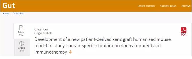 參考文獻:Development of a new patient-derived xenograft humanised mouse model to study human-specific tumour microenvironment and immunotherapy. Gut. 2018 Mar 30.