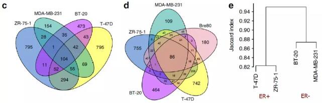 作者發(fā)現(xiàn)ER+乳腺癌細胞系中互作peak數(shù)目顯著高于ER-乳腺癌細胞系,且ER+乳腺癌細胞系中存在很大一部分距離大于2Mb的互作片段。分析樣本間互作peak的Jaccard相似性,發(fā)現(xiàn)ER+和ER-各自組內具有更高的相似性。