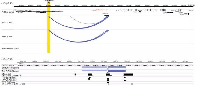 互作peak示例:下圖為10q26.13基因座的互作peak(loop),在ER+乳腺癌細胞系和正常乳腺上皮細胞系中鑒定到了互作peak,但是ER-乳腺癌細胞系中則未檢測到?;プ靼谢虻霓D錄起始位點(TSS)位于捕獲區(qū)域內,并且和相距幾百Kb遠的特異的HindIII酶切片段形成環(huán)(互作Peak)。在T-47D細胞系中,這些遠距離片段與DNase I超敏位點、CTCF、FOXA1、GATA3轉錄因子結合位點以及雌激素受體ERα結合位點共定位。