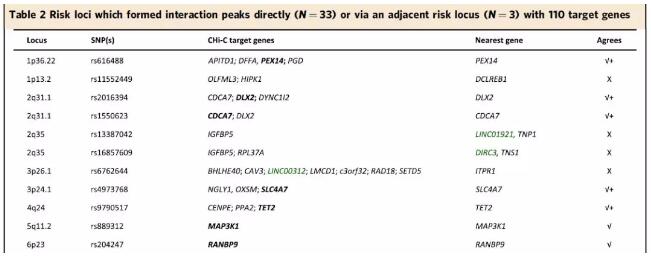 作者將靶基因定義為至少兩個細胞系中,定位到捕獲區(qū)域內或捕獲區(qū)域的順式作用區(qū)間(≤5 Mb)的基因,且其轉錄起始位點/TSS定位在相互作用片段上。以此為準能夠為51個基因座中的33個(64.7%)鑒定到110個推定的靶基因,其中94個為蛋白編碼基因,16個非編碼RNA。作者比較了GWAS風險SNP位點的臨近基因以及本研究中鑒定到的靶基因,發(fā)現(xiàn)其中24個基因座的鄰近基因是唯一的CHi-C靶基因(N = 9)或幾個CHi-C靶基因之一(N = 15)。
