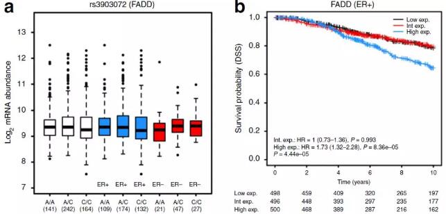 作者所納入的風險SNP在此之前只有一個位點(16q12.1-rs3803662)報道了與疾病預后相關。本研究中作者直接分析了代謝型乳腺癌隊列中潛在的靶基因的表達水平與的患者預后之間的關聯(lián)(分別對ER +和ER-亞組進行生存分析)。其中32個靶基因(33%)與ER +乳腺癌患者的DSS相關,6個DSS相關的靶基因為eQTL靶基因。