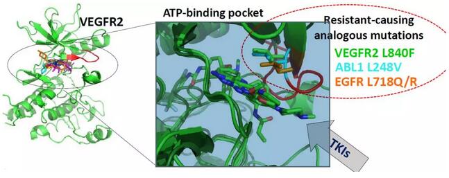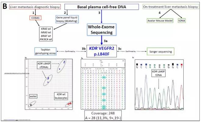 西班牙國家癌癥研究中心(CNIO)胃腸癌臨床研究組的學者們,納入一例RAS / BRAF / PIK3CA未發(fā)生突變且對抗VEGF抑制劑具有抗性的轉(zhuǎn)移性結(jié)腸直腸癌患者,收集其血漿提取cfDNA,分離白細胞提取gDNA以及轉(zhuǎn)移組織提取tDNA,進行全外顯子組測序,發(fā)現(xiàn)WES-cfDNA與腫瘤外顯子組測序結(jié)果一致率為77%,且能夠鑒別KDR / VEGFR2 L840F克隆,該體細胞突變是患者難治性的原因。其他腫瘤數(shù)據(jù)庫如TCGA等KDR體細胞突變的樣本比例在1-3%,且位于其他癌癥相關激酶(如EGFR,ABL1和ALK)中經(jīng)常突變的蛋白質(zhì)殘基中。此外,作者還進行了一系列功能實驗,包括不同細胞系VEGFR2突變體異位表達、激酶和藥物敏感性測定以及細胞和患者衍生的異種移植瘤實驗。結(jié)果表明,L840F對抗血管生成藥物產(chǎn)生強烈的抗性,而KDR熱點突變體R1032Q賦予對強VEGFR2抑制劑的敏感性。小鼠移植瘤實驗表明VEGFR2突變體D717V,G800D,G800R,L840F,G843D,S925F,R1022Q,R1032Q和S1100F 促進小鼠腫瘤生長。