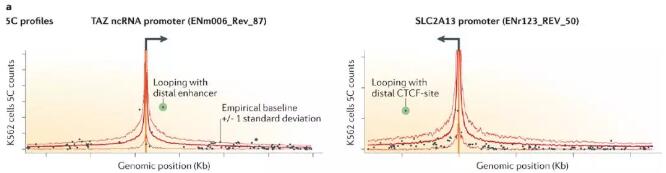盡管5C技術(shù)存在上述缺陷,但仍舊揭示了染色質(zhì)不同區(qū)域間遠(yuǎn)程互作參與基因表達(dá)調(diào)控的普遍規(guī)律。Sanyal等人發(fā)現(xiàn)了基因啟動(dòng)子和遠(yuǎn)端基因座之間有數(shù)千個(gè)重要的遠(yuǎn)距離loop互作,強(qiáng)調(diào)了許多基因啟動(dòng)子通過染色質(zhì)環(huán)與遠(yuǎn)端元件互作的觀點(diǎn)。普遍規(guī)律如下:1)許多染色質(zhì)成環(huán)事件是活性基因啟動(dòng)子和類似于活性增強(qiáng)子的遠(yuǎn)端元件之間的細(xì)胞類型特異性互作,這與這些染色體結(jié)構(gòu)在基因活化中的作用一致;2)其中一類豐富的遠(yuǎn)程互作即是啟動(dòng)子區(qū)與絕緣蛋白CTCF結(jié)合位點(diǎn)之間成環(huán);3)通常認(rèn)為調(diào)控元件可以調(diào)節(jié)*鄰近的基因,但是成環(huán)互作經(jīng)常跳過一個(gè)或多個(gè)基因,這表明基因和元件的線性排列是它們之間功能和結(jié)構(gòu)互作的較差預(yù)測因子;4)基因和調(diào)控元件之間的關(guān)系并不唯一:一個(gè)基因可以與多個(gè)遠(yuǎn)端元件互作,同時(shí)一個(gè)元件也可以與多個(gè)基因互作。