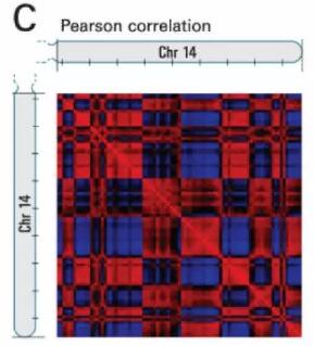 圖片引自Comprehensive mapping of long-range interactions reveals folding principles of the human genome[J]. science, 2009, 326(5950): 289-293,互作矩陣中顏色表示每對1Mb基因座染色質(zhì)間互作相關(guān)性系數(shù)(紅色:1,藍(lán)色:-1)。
