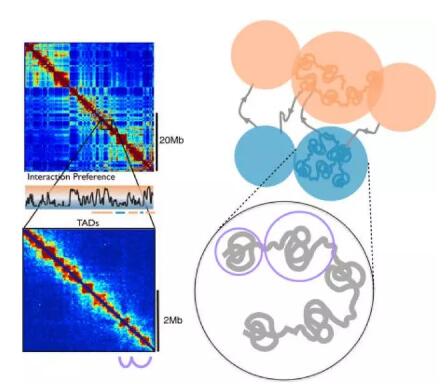 哺乳動(dòng)物基因組的染色體內(nèi)和染色體間相互作用圖揭示了一種相互作用模式,可以近似分為兩個(gè)隔間(A和B,或稱區(qū)室/隔室),它們沿著染色體交替,并且具有約5Mb的特征尺寸。A隔間優(yōu)先與整個(gè)基因組中的其它A隔間相互作用。 同樣,B隔間與其它B隔間相關(guān)聯(lián)。隔間信號可以通過互作圖的特征向量擴(kuò)展來量化。 A / B室信號不是簡單的雙相(僅代表兩種狀態(tài)),而是連續(xù)的,并且與轉(zhuǎn)錄活性指標(biāo),如DNA可及性、基因密度、復(fù)制時(shí)間、GC含量和幾個(gè)組蛋白標(biāo)記相關(guān)。A-隔間主要是常染色質(zhì)-轉(zhuǎn)錄活躍區(qū)域,B-隔間則主要是聚集在一起的異染色質(zhì)(轉(zhuǎn)錄失活區(qū)域)。