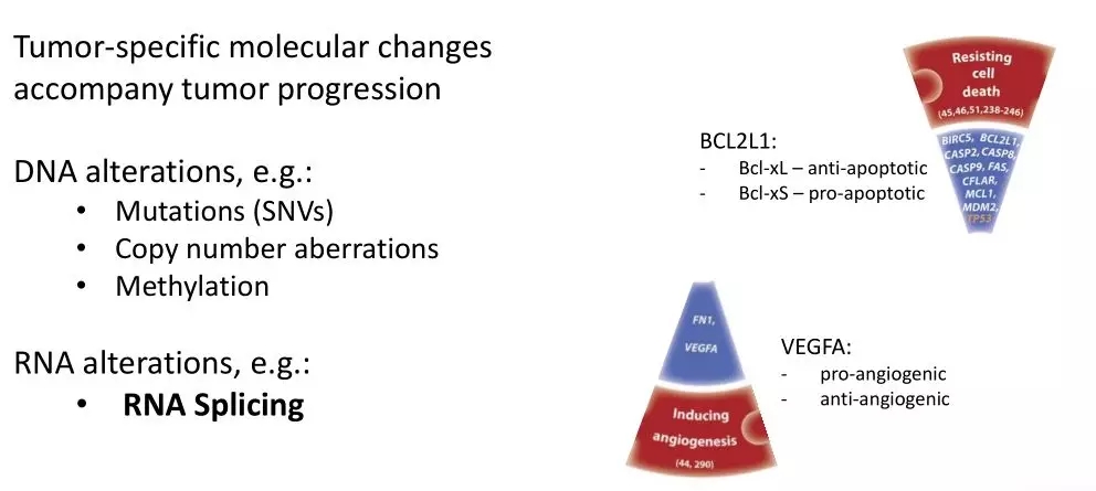 另外一個結腸癌標志物相關的研究中,Malgorzata A Komor等[8]通過整合RNA-seq、Iso-seq及LC-MS/MS數(shù)據(jù)建立了一個適于臨床研究的蛋白組數(shù)據(jù)分析流程,從分析結果中可以發(fā)現(xiàn)除了DNA水平上的變異,RNA水平上發(fā)生的異常剪接也會導致癌癥的發(fā)生發(fā)展,比如在結直腸癌(CRC)中,SRSF1導致RAC1中exon 4的保留,產(chǎn)生了一種有助于癌細胞存活的Rac1b isoform;BCL2L1的可選擇性5 ‘ s端剪接事件的發(fā)生助于抵抗細胞死亡使;VEGFA的可選擇性3 ‘端剪接事件會導致癌癥中抗血管生成的isoform的轉變,并誘導血管生成。