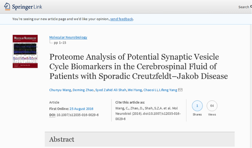 案例二: ProteomeAnalysis of Potential Synaptic Vesicle Cycle Biomarkers in the Cerebrospinal Fluidof Patients with Sporadic Creutzfeldt–Jakob Disease