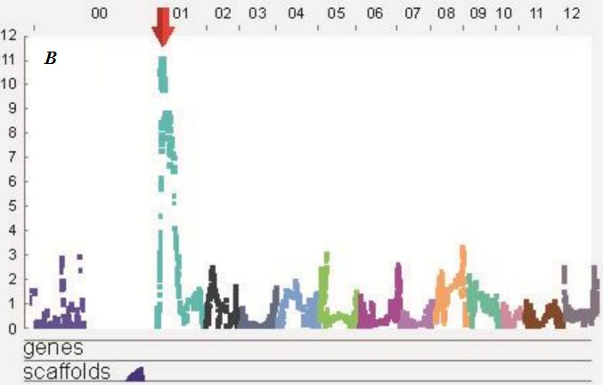 每個(gè)樣品產(chǎn)生5-15M的100bp序列,與參考基因組比對(duì)獲得82140個(gè)SNP,甜瓜基因組預(yù)測(cè)有27427個(gè)基因,本研究共有16000個(gè)基因表達(dá)。以SNP為基礎(chǔ)劃bin,所有個(gè)體共檢測(cè)到6636個(gè)重組事件,產(chǎn)生3663個(gè)bin(圖1A),bin的平均長度為72.6kb。遺傳圖譜構(gòu)建總圖距為2047cM,利用該圖譜進(jìn)行對(duì)之前未能掛載染色體的scffold進(jìn)行掛載,并對(duì)部分組裝錯(cuò)誤進(jìn)行了糾正(圖1B中圓圈)。