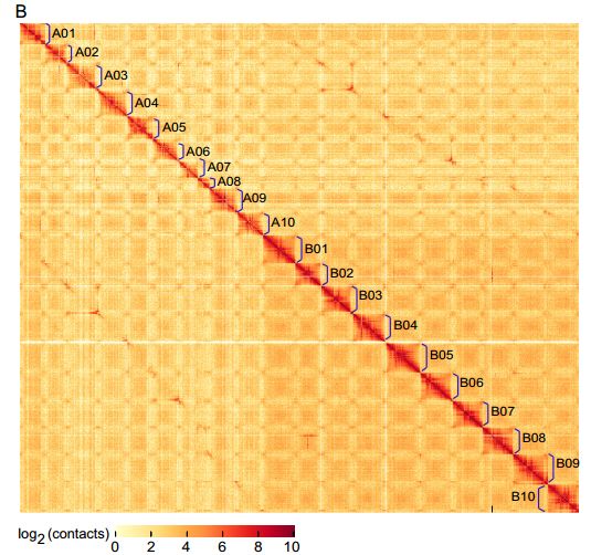 ????????除了常規(guī)基因組的評估手段之外,我們還利用更直觀的Hi-C對該基因組序列進行準(zhǔn)確性評估,并與其祖先種A和祖先種B進行了比較。比較栽培種A.monticola得到的subgenome與祖先A基因組A.duranensis, 祖先B基因組A.ipaensis的Hi-C熱圖,整體熱圖一致性非常高。(A圖是A.monticola的HiC熱圖,B圖祖先A基因組A.duranensis, 祖先B基因組A.ipaensis的Hi-C熱圖)