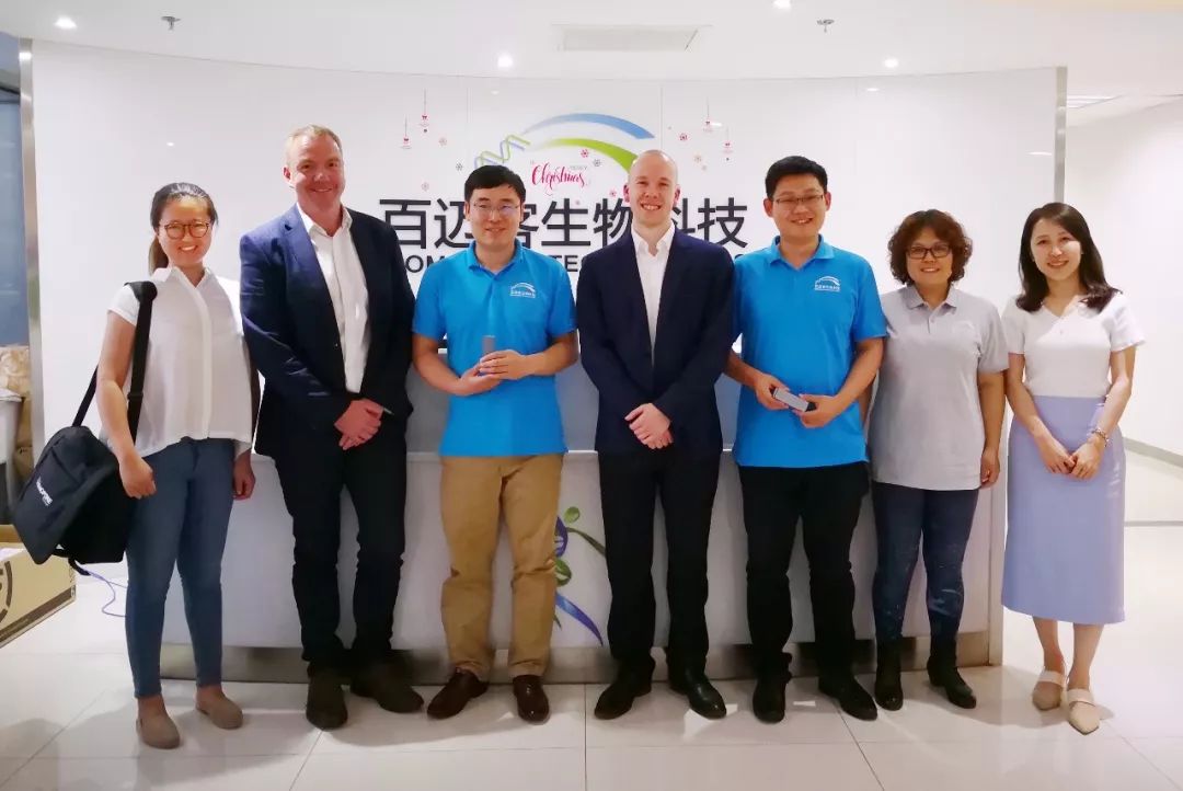 百邁客與Oxford Nanopore 商業(yè)運營副總裁Richard ,中國區(qū)商務(wù)負責人Thomas及技術(shù)支持Lin與Eva一行合影