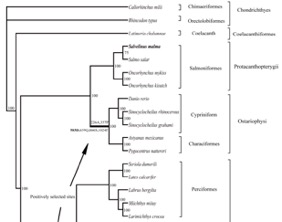 為了探究S.m-C4和S.m-TLR5免疫基因在魚類體內(nèi)的系統(tǒng)發(fā)育情況,中國淡水花羔紅點鮭與另外23條硬骨魚、兩條鯊魚和一條腔棘魚用于C4基因研究。重建貝葉斯系統(tǒng)發(fā)育中,四種鮭魚形魚類組合在一起,具有較高的后驗概率(PP)(圖7)。同時三種鯉形目魚類和兩種鰓形目魚類分別用1.00 PP進行分組,形成骨鰾總目分支。這一結(jié)果與傳統(tǒng)分類學(xué)和系統(tǒng)發(fā)育相一致。硬骨魚分為鰓形目、原鰓形目、鰓形目和棘鰓目四支,其中,兩條鯊魚是外群。