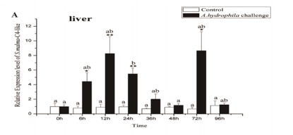 為探討這兩種免疫基因在細(xì)菌侵入的免疫應(yīng)答,采用定量實時PCR(qPCR)技術(shù),觀察注射后96h內(nèi)肝、脾臟相關(guān)基因的表達。對于鹽水處理組,即對照組,S.m-C4基因在研究的所有時間點肝臟中均無顯著差異(圖9)。對于嗜水氣單胞菌注射組,即實驗組,肝臟在24小時有顯著增加(p=0.04),在12小時和72小時出現(xiàn)兩個峰值,邊緣顯著。在6h、12h、24h和72h,實驗組與對照組有顯著性差異。對照組脾臟中S.m-C4基因的相對表達上下波動,8個時間點之間差異不顯著,實驗組脾臟中S.m-C4基因的相對表達除72h外,其余時間點均無差異,與細(xì)菌注射組0 h相比減少59.6%。