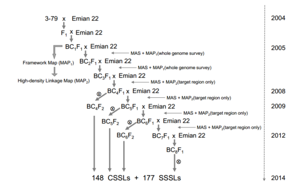 著絲粒區(qū)域鑒定:blastn,SPSS software (version 17.0)?;基因組共線性分析:MUMmer (version 3.23),GATK(version 3.1.1),Samtools(version 0.1.19)?,MCScanX package結(jié)構(gòu)變異檢測:MUMmer3 (version 3.23);二倍體棉重測序SNPs鑒定:Trimmomatic (version 0.32),BWA168CSSLs群體SNPs鑒定:染色體片段置換系(CSSLs)的構(gòu)建(圖1),測序深度(6X),插入片段:350 bp,BWA,GATKSamtools;CSSLs群體QTLs定位與表達分析:QTL IciMapping (version 4.0)?;TopHat2 (version 2.0.13)?;Cufflinks (version 2.2.1);STRUCTURE (version 2.3)?;TASSEL software (version 5.0)?;