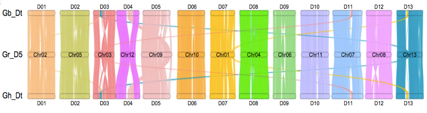 四倍體陸地棉和海島棉基因組的組裝使得研究人員能夠進一步探索四倍體棉亞基因組和其二倍體祖先之間的基因組差異。首先通過對具有D型基因組的13份二倍體材料進行重測序分析,分析顯示在兩種四倍體棉D-亞基因組具有相同的二倍體祖先種雷蒙德氏棉G. raimondiiD5 genomeD亞基因組供體);進而利用二倍體雷蒙德氏棉G. raimondii直接進行基因組比較分析,發(fā)現(xiàn)四倍體陸地棉和海島棉與雷蒙德氏棉相比,都有一些獨特的結(jié)構(gòu)變異,如在海島棉染色體D05和陸地棉D12中均存在大的染色體臂間倒位,暗示這些變異出現(xiàn)在多倍化之后(圖5)。研究人員還觀察到兩個四倍體相對于G. raimondii共有一些結(jié)構(gòu)變異,例如染色體D09中兩個四倍體發(fā)生了大的反轉(zhuǎn)(圖5)。研究中同時運用了二倍體祖先種亞洲棉G. arboreumA2 genome,A亞基因組供體)的Hi-C數(shù)據(jù),與陸地棉和海島棉A亞基因組進行比對,檢測棉由二倍體到四倍體多倍化過程中發(fā)生的結(jié)構(gòu)變異,Hi-C具體矩陣圖顯示在13條染色體中發(fā)生了大規(guī)模的染色體重排,其中發(fā)部分變異為兩個四倍體的棉的A亞基因組共有。研究中發(fā)現(xiàn)染色體A06中*大的染色體臂間倒位(in2)在陸地棉中是特有的(圖3?左),表明這種結(jié)構(gòu)變異可能在染色體多倍化后發(fā)生。因此得出結(jié)論,二倍體棉花中的A基因組在異源多倍化后被重組,導致不同四倍體(陸地棉和海島棉)中發(fā)生了大染色體倒位。