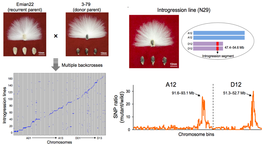 通過研究發(fā)現(xiàn)了在陸地棉(G.?hirsutum?acc. TM-1)和海島棉(G. barbadense?acc. 3-79)間存在廣泛的遺傳變異,進一步推測這些變異的一部分可能是造成表型差異的原因,包括纖維性狀。為了利用這些變異進行定向育種,研究人員構(gòu)建了一個漸滲系群體,旨在引入有利的變異,控制從G.barbadenseG. hirsutum等重要農(nóng)藝性狀的形成,如纖維質(zhì)量。研究人員通過分子標記對168份漸滲系材料進行測序,并鑒定了涵蓋所有26條染色體的466個基因滲入片段(圖6)。研究人員發(fā)現(xiàn)了在染色體D12中含有漸滲片段的漸滲系,其具有有限的絨毛纖維,類似于其供體親本G.barbadense?3-79(圖6,圖7上),基因滲入片段的位置與無絨天然突變體G. hirsutum?Xuzhou142fl的圖譜測序所示的位置相同,然而其遺傳基礎以前未被充分了解(圖7下)。這些結(jié)果表明,陸地棉(G. hirsutum)中無絨毛突變體的遺傳變異與海島棉(G. barbadense)中的數(shù)量性狀基因座(QTL)共定位。該漸滲片段與天然纖維突變體的特征將有助于比較分析海島棉和陸地棉之間的絨毛纖維起始機制。