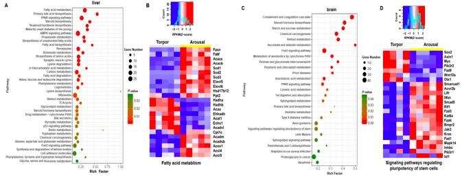 與其它高原哺乳動物不同,喜馬拉雅旱獺在冬季冬眠。為了闡述旱獺冬眠的分子機(jī)制,研究人員分析了來自喜馬拉雅旱獺肝臟和大腦的RNA-seq數(shù)據(jù),以表征在冬眠/覺醒周期中基因表達(dá)的變化。差異表達(dá)的基因(DEGs)顯著富集在肝臟中脂肪酸代謝,萜類骨架生物合成和初級膽汁酸生物合成的途徑(圖3 A)。并清楚地觀察到在冬眠狀態(tài)下,參與脂肪酸降解的基因的上調(diào)及參與脂肪酸合成的基因的下調(diào),暗示了一個(gè)√確的脂質(zhì)代謝調(diào)節(jié)機(jī)制(圖3 B)。此外,還發(fā)現(xiàn)在覺醒狀態(tài)下,包含與藥物代謝相關(guān)的基因-細(xì)胞色素P450,氨基酸的生物合成和碳水化合物分解代謝相關(guān)基因的總體下調(diào)。