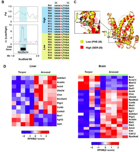 為了更好地了解喜馬拉雅旱獺的高原適應(yīng)性機(jī)制,研究人員從極高海拔(海拔> 4,500 m,n = 10)和相對低海拔(<1,900 m,n = 10)收集了20只喜馬拉雅旱獺。研究人員首先測量了血液參數(shù),發(fā)現(xiàn)與低海拔喜馬拉雅旱獺相比,高海拔喜馬拉雅旱獺的一些血液相關(guān)性狀,尤其是紅細(xì)胞計(jì)數(shù),血紅蛋白濃度和平均紅細(xì)胞體積顯著增加。接下來,對每個(gè)喜馬拉雅旱獺進(jìn)行了全基因組測序,并在喜馬拉雅旱獺基因組中搜索了具有高種群分化(Fst)和多樣性比率(qp,low/qp, high)的區(qū)域,最終鑒定了分布在喜馬拉雅土撥鼠基因組不同scaffolds?中的24.84 Mb受選擇的區(qū)域。這些區(qū)域含有383個(gè)功能基因,與非選擇性基因相比,這些基因具有更高的Ka / Ks值(P <0.01),主要功能類別包括“缺氧反應(yīng)”,“DNA修復(fù)”,“血管生成”,“心臟功能”,“脂肪酸代謝”,“細(xì)胞周期”,“發(fā)熱”和“鈣信號通路”。參與缺氧誘導(dǎo)因子-1(HIF-1),血管內(nèi)皮生長因子(VEGF)或其它缺氧相關(guān)信號通路的10個(gè)功能基因,包括Slc25a14,Nox-1,Hmox1,Vegfr2,Atg16l2,Bex1,Ptgr2,Gprasp1,F(xiàn)am46d?和Chd3,在高海拔和低海拔群體之間顯示出明顯的基因分型差異(圖4 A)。在Slc25a14中發(fā)現(xiàn)了非同義替換(由Ser28取代Phe28,F(xiàn)28S),其顯示出*強(qiáng)的分化信號(FST = 0.73)(圖4 A和B)?;谕唇5腟lc25a14的三維結(jié)構(gòu)顯示,F(xiàn)28S替換發(fā)生在N末端的loop區(qū)域,并且由于氨基的電荷和極性的變化而增加其與相鄰的α-螺旋的距離(圖4 C)。為了進(jìn)一步評估這一變體的功能影響,研究人員將突變體Slc25a14與其在不同哺乳動物中的直系同源基因進(jìn)行比對,并發(fā)現(xiàn)Phe28在比對的其它動物中高度保守。該突變體功能影響的預(yù)測證明F28S取代是有害的,所有這些結(jié)果都表明F28S突變可能是高海拔群體Slc25a14選擇性清除的結(jié)果。為了推測旱獺高海拔適應(yīng)和冬眠的遺傳適應(yīng)性機(jī)制,研究人員在選擇性清除區(qū)域鑒定到了116個(gè)差異表達(dá)基因,在這些基因中,25個(gè)差異表達(dá)基因與HIF-1途徑相關(guān),主要屬于DNA修復(fù),血管生成,脂肪酸代謝,細(xì)胞凋亡/細(xì)胞周期和發(fā)熱的類別相關(guān)。在冬眠/覺醒周期中,大量選擇性清除基因具有差異表達(dá),表明這兩種生物學(xué)過程之間存在共同的遺傳影響(圖4 D)。在這些基因中,Bex1, Apln, kcne1l, Med12, Dad1和Fgf16在冬眠階段肝臟或腦中顯著上調(diào)(圖4 D),進(jìn)一步證明這些基因參與冬眠和高原適應(yīng)性,先前的研究報(bào)道了這些基因參與許多生理過程,包括神經(jīng)元分化,肝再生,血管生成和能量代謝,而這需要進(jìn)一步的實(shí)驗(yàn)驗(yàn)證。