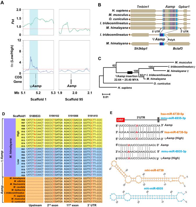 假基因逐漸被認(rèn)定為是適應(yīng)性表型多樣化的重要調(diào)節(jié)因子,與選擇性清除信號相關(guān),研究人員鑒定了27個(gè)參與極高海拔適應(yīng)的候選假基因,占全基因組范圍內(nèi)假基因的1.83%。這一比率幾乎與具有1.78%的功能基因的比率相當(dāng),表明它們在極端環(huán)境的適應(yīng)性中的作用不可忽略。與蛋白質(zhì)編碼基因中發(fā)現(xiàn)的群體基因型差異一致,研究人員在高海拔群體中觀察到受選擇的假基因中幾乎固定的突變,例如ΨAamp,ΨAdl1和ΨRnf114。在這些假基因中,血管相關(guān)的遷移細(xì)胞蛋白假基因(ΨAamp)具有完整的基因結(jié)構(gòu)并顯示出*高的Fst值(Fst = 0.67),但ΨAamp未被檢測為受選擇性基因(圖4 A和5 A)。ΨAamp的結(jié)構(gòu)顯示它是一個(gè)整合的加工假基因,其mRNA通過逆轉(zhuǎn)錄被插入基因組中(圖5 B)。這個(gè)假基因含有過早終止密碼子(第208個(gè)核苷酸,C> T),缺失/插入和移碼突變,使其不能翻譯成功能性的蛋白,Aamp和ΨAamp的共線性分析表明在不同哺乳動物中Aamp是高度保守的。然而,在地松鼠和喜馬拉雅旱獺中發(fā)現(xiàn)并保存了高度保守的共線性位點(diǎn)(圖5 B),進(jìn)一步的系統(tǒng)發(fā)育分析表明,ΨAamp和Aamp屬于兩個(gè)獨(dú)立的分支,基于序列分歧插入時(shí)間的估算暗示假基因的插入事件發(fā)生在約22.64~25.40 MYA,在喜馬拉雅旱獺和地松鼠分化之前(圖?5 C)。這些發(fā)現(xiàn)支持古老的假基因?qū)τ谒墒缶哂刑禺愋圆墓餐淖嫦冗z傳而來這一假設(shè),然而,與地松鼠相比,喜馬拉雅旱獺顯示Aamp和ΨAamp之間的序列距離較小,這表明存在選擇性壓力來維持旱獺的遺傳元素。