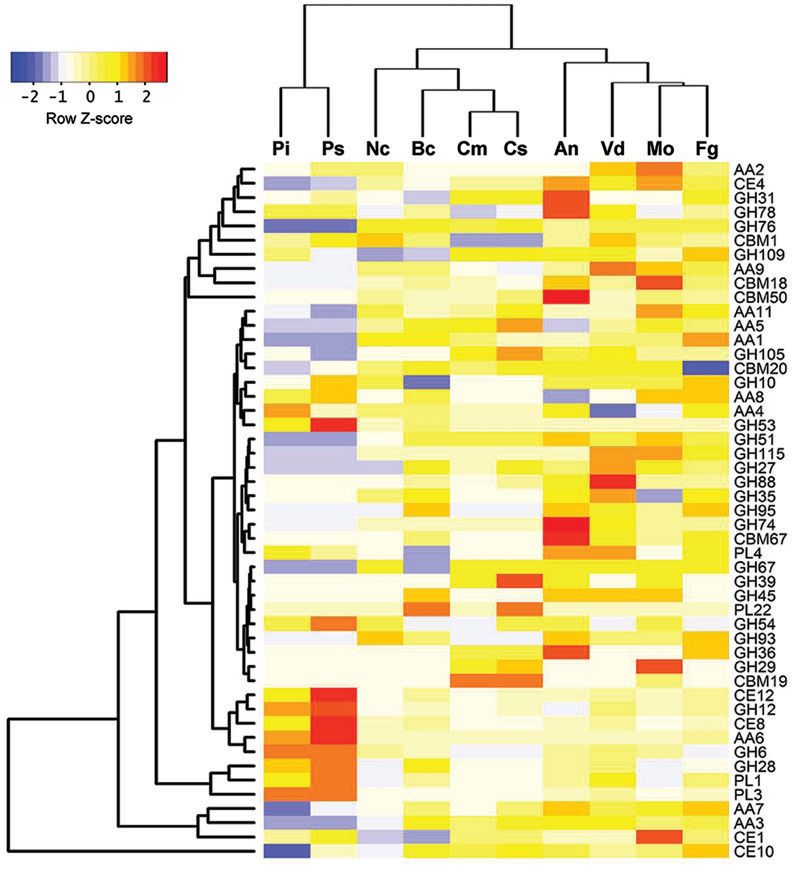 成熟的植物致病真菌可以分解并利用CAZymes的植物細(xì)胞壁多糖。尾孢菌(Cercospora sojina)含有596個預(yù)測的CAZymes。與其他真菌相比,C.sojina具有更大的潛在碳水化合物酯酶組,其可催化取代糖的N-去?;?。在C. sojina基因組中,有大約23.5%的潛在分泌蛋白被預(yù)測為CAZyme,證明C.sojina可能在入侵期間使用大量CAZymes來消化宿主細(xì)胞壁。有趣的是,其中一個CAZymes家族,即糖苷水解酶GH109家族,是高度富集的(圖6)。
