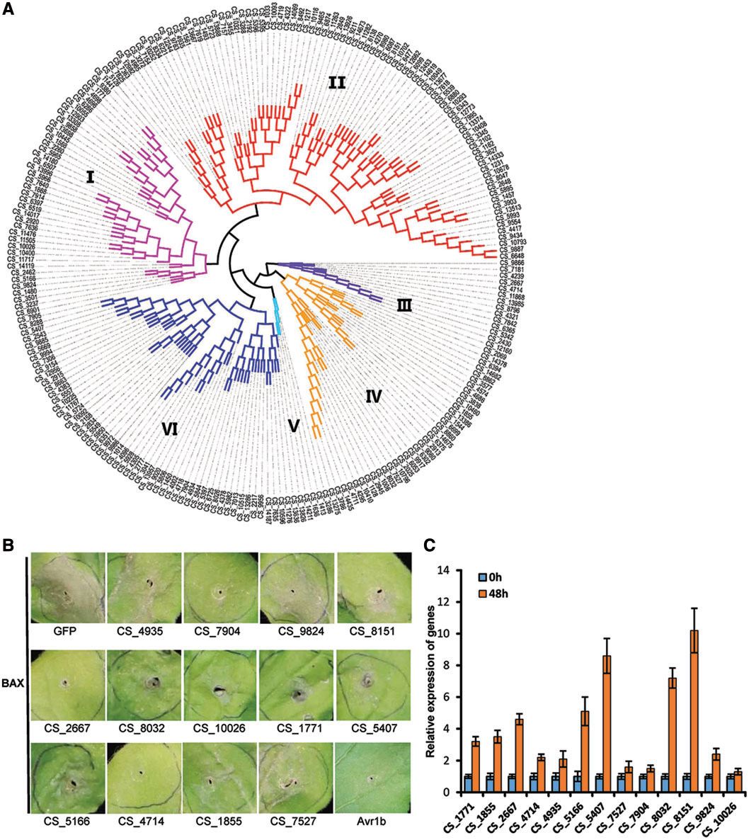 因此,我們嘗試研究效應(yīng)器功能。促凋亡小鼠蛋白BAX誘導(dǎo)的本氏煙草程序性細(xì)胞死亡(PCD)在生理上可能與病原體引起的防御相關(guān)的過敏反應(yīng)相似,提供了有價值的篩查可以抑制與防御相關(guān)的PCD的效應(yīng)物的方法。我們隨機選擇50個效應(yīng)子并在本塞姆氏煙草中瞬時表達它們以篩選可以抑制BAX觸發(fā)的PCD(BT-PCD)的潛在效應(yīng)物。結(jié)果表明,約1/4選擇的效應(yīng)子強烈抑制BT-PCD(圖7B)。此外,qRT-PCR結(jié)果顯示,大多數(shù)這些推定的效應(yīng)子在C.sojina感染后48小時被轉(zhuǎn)錄誘導(dǎo)(圖7C),這意味著它們可能有助于大豆灰斑病的早期感染。